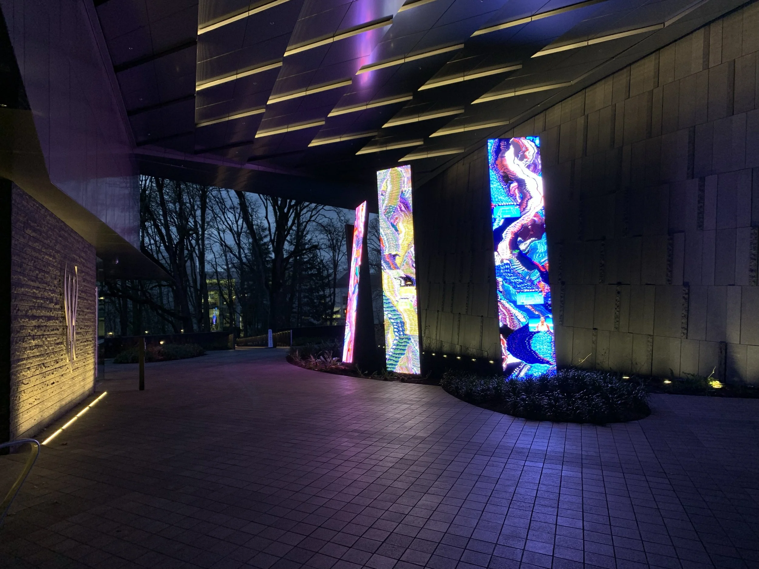 Artist Daniel Canogar, Madrid, Spain and NY, lit up the entrance with manipulated digital feed of Serena matches